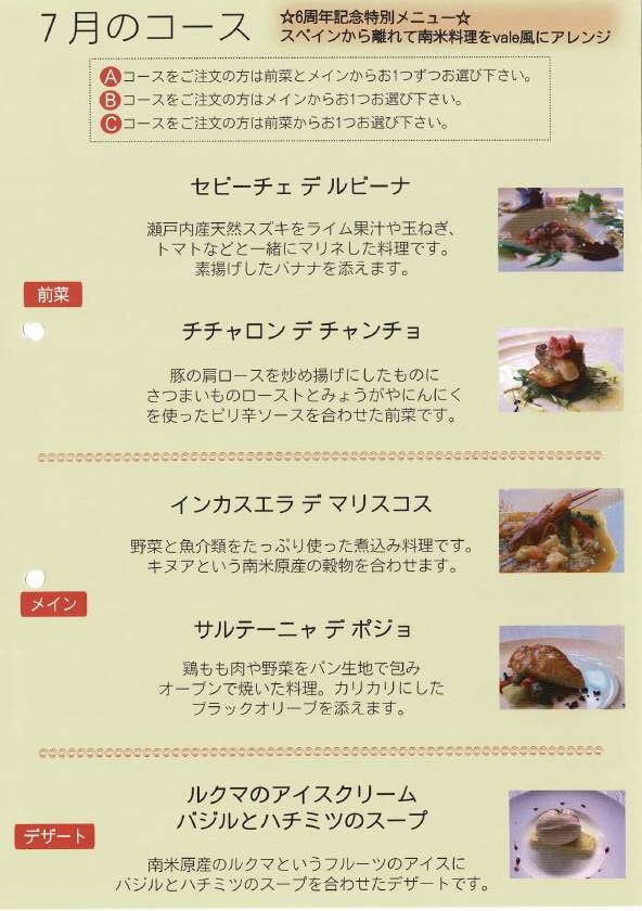 Jul.20132013年7月のメニューは6周年特別企画としてこの年の春に行った南米の代表的な料理をvale風にアレンジしたメニューをご用意しました。また夕方4時からの「シエスタコンサート」と題したフラメンコギターの演奏会も開催しました。 Jun.2013前の記事 Aug.2013次の記事